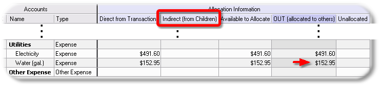 Here's an example. In one of the tutorial lessons you fully allocated Utilities:Electricity expense to a couple of profit centers. That allocation is indicated by the red arrow in the OUT (allocated to others) column of the illustration below. But nothing was done with Utilities:Water expense, and its unallocated amount is indicated by the green arrow in the Unallocated column. This unallocated amount also appears in the Indirect (from sublevels) column for the Utilities parent account, as indicated by the blue arrow. In other words, ManagePLUS Gold has accumulated the unallocated amount ($152.92) from the Utilities:Water subaccount to make it available for allocating from Utilities parent account.