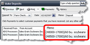 | | Here's a Deposit showing quantities entered as formulas. In this example, quantities for the Sales:Grain:Soybeans (bu.) account need to be entered in bushels. (In fact, the abbreviation "bu." has been made part of the account name to serve as reminder of the appropriate unit of measure for this account.) |