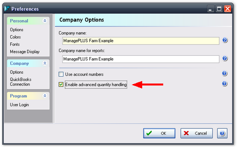 ManagePLUS supports a number of advanced quantity handling features, all of which allow entering additional quantity information in the Memo or Description field of QuickBooks transactions. ManagePLUS uses this quantity information to enhance the information and statistics in reports. But not everyone needs the advanced quantity handling features, so ManagePLUS keeps them hidden until you enable them, as described in this topic. Enabling advanced quantity handling