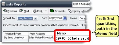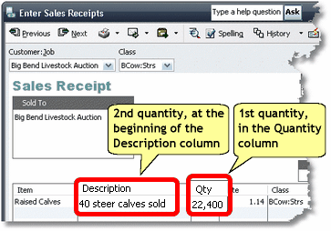 On QuickBooks forms which have a Quantity column: QuickBooks forms which support Items—Invoices, Bills, Checks, Sales Receipts, etc.—all have a Quantity column. The first quantity goes in the Quantity column, and the second quantity goes in the Memo or Description field on the same line. Here's an example of a rancher's sale of some calves. The calves' total weight is entered in the Quantity column, and the number of head (count) is entered at the beginning of the Description field.