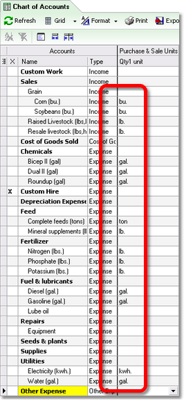 | For your convenience, accounts in the ManagePLUS Farm Example which are to receive unit of measure entries, have a suggested unit of measure in parentheses at the end of the account name. |