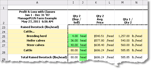 The rows highlighted in yellow are a class-by-class breakdown of sales for the Raised livestock (lbs, head) account. We've scrolled to the right to see the columns that hold information related to dual quantities. In case you've forgotten, for the Raised livestock account Qty 1 is the weight of animals sold, in pounds. Qty 2 is the number of animals sold (number of head). As you can see, ManagePLUS has provided a total for Qty 2, and has also calculated the average selling price per head and average selling weight (Qty 1 divided by Qty 2).