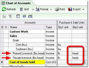 | • | Type a unit of measure in the Qty2 unit column, for accounts where a second unit of measure is appropriate—which basically is any account which represents things bought or sold with both a "weight" and a "count" as important management information.