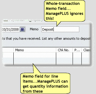 The usual place to enter transaction quantities is in the Quantity column of a form which supports QuickBooks Items (from the Items list)—Invoices, Sales Receipts, Write Checks, Purchase Orders, etc. These forms all have a Quantity column where you can enter a quantity directly. But some QuickBooks forms, like the Deposits form, do not support using items and therefore do not have a Quantity column. ManagePLUS gives you a way to enter sales or purchase quantities on those forms. This approach is also useful if you simply don't wish to set up Items for things you buy or sell. The rules for Memo/Description field quantities are: