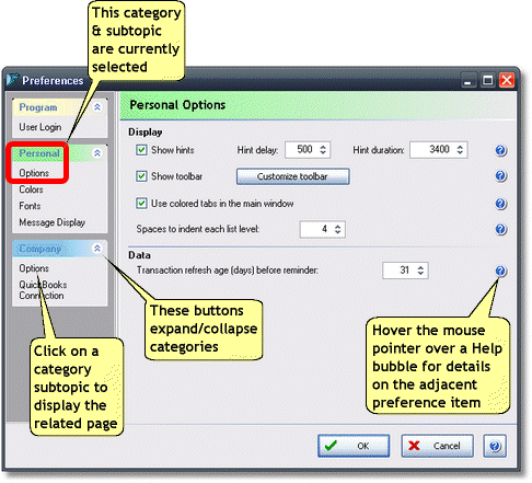 The Preferences dialog is where you may change preference settings that control how the ManagePLUS program looks and how it operates. Here is one of the many preference pages it contains: