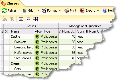 | • | The A Mgmt Qty and B Mgmt Qty columns let you enter that will be used for per-unit analysis of revenues and expenses associated with classes, such as labor hours, miles driven, amounts of production, tenant-months, etc. You may supply one or both management quantities for any class, or none at all (they're optional). |