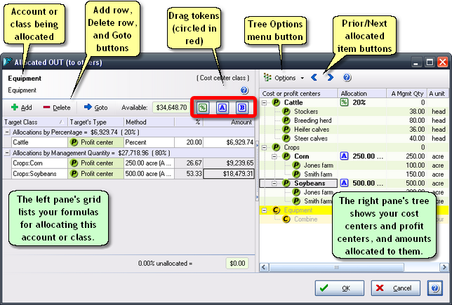 Right-pane tree (cost centers and profit centers tree) This tree view shows your cost centers and profit centers, and the allocations assigned to them. Account or class being allocated Name of the account or class being allocated to cost centers and/or profit centers by this dialog. Add row button Clicking here adds a new, blank row to the allocations list (the left-pane grid). Delete row button Clicking here deletes the current row from the allocations list. Goto button Clicking here jumps to the cost center or profit center item of the current row, after closing this dialog. Drag tokens Drag one of these tokens onto a cost center or profit center in the tree (in the right pane), to add a new allocation formula row to the list. [%] - adds a new Percentage allocation row. [A] - adds a new Mgmt. Qty A allocation row. [B] - adds a new Mgmt. Qty B allocation row. Tree Options menu button Clicking here displays a menu of options for managing the right-pane tree, such as expanding or collapsing all tree branches, etc. Prior/Next allocated item buttons Clicking one of these lets you move backward or forward through the tree, stopping only at tree nodes which have allocations targeting them (useful if your tree is very large). See also: Tutorials: Cost Centers, Profit Centers, and Allocation Working with Cost Centers, Profit Centers, and Allocation in How-To Procedures Allocation details dialogs in the Reference section |